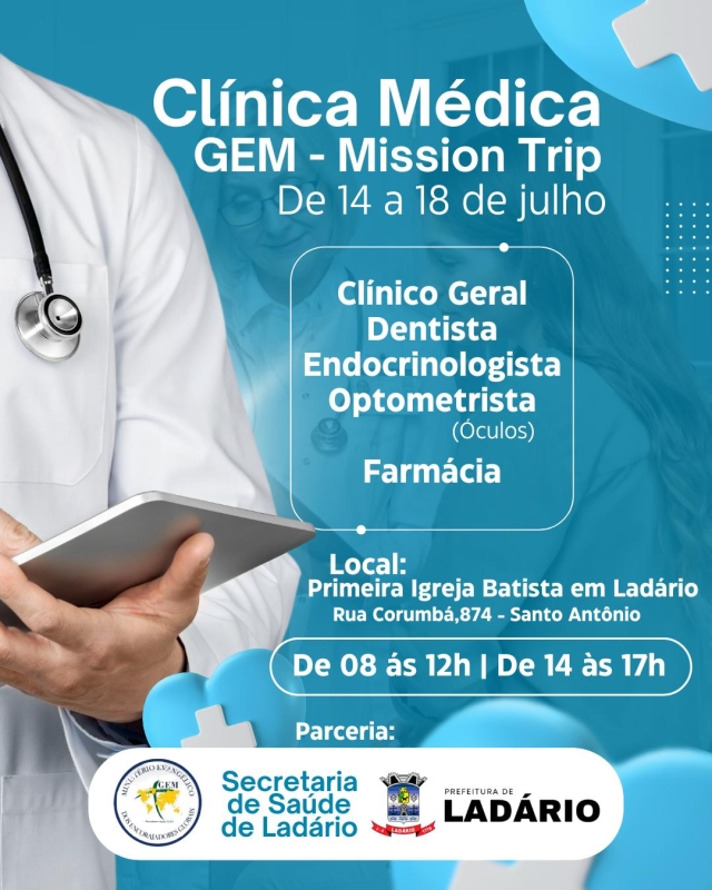 A Prefeitura de Ladário, por meio da Secretaria Municipal de Saúde, em parceria com o Ministério Evangélico GEM – Mission Trip, promove de 14 a 18 de julho uma ação de saúde gratuita voltada à população ladarense.