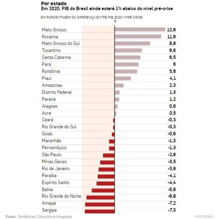 O PIB brasileiro fechará o ano 1% abaixo do nível pré-crise. Os piores resultados são esperados para Bahia (-5,6%), Rio Grande do Norte (-6,9%), Amapá (-7,2%) e Sergipe (-7,3%). O PIB é a soma de todos os bens e serviços produzidos em determinada localidade.