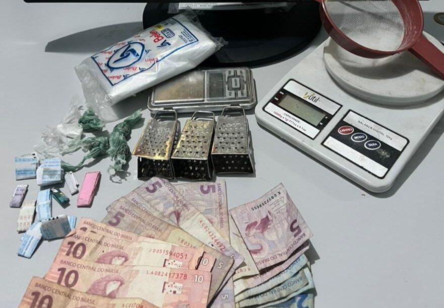 Na residência onde ocorreu a abordagem, foram encontradas duas balanças de precisão, três raladores com vestígios de droga, uma peneira e embalagens plásticas utilizadas no preparo e comercialização dos entorpecentes.