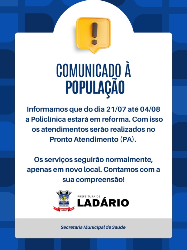A Prefeitura de Ladário informa que a Policlínica Municipal passará por obras de melhoria em sua estrutura física entre os dias 21 de julho e 4 de agosto. A intervenção contempla substituição de pisos e ajustes nas portas de acesso, com o objetivo de aprimorar o ambiente para profissionais e pacientes.