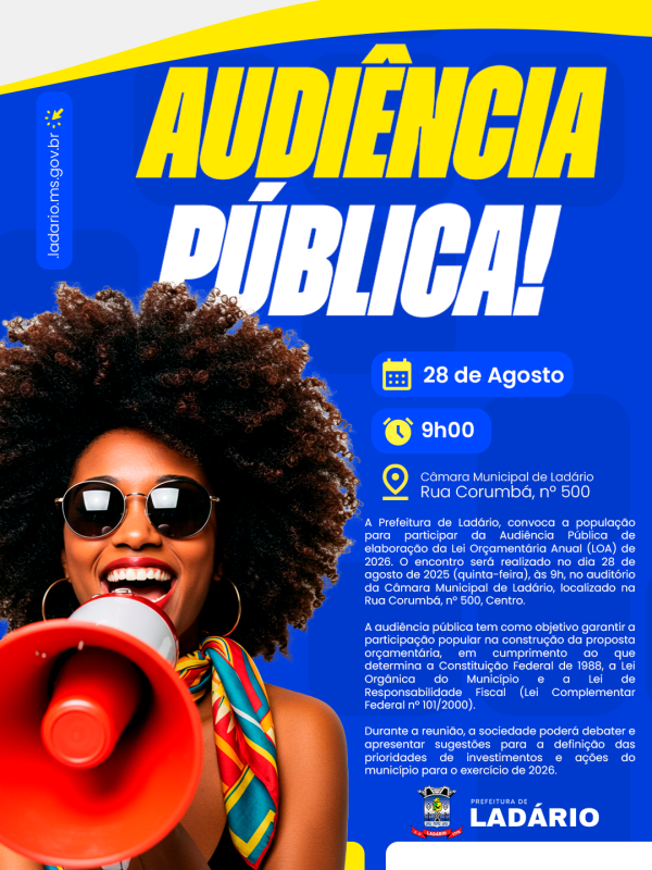 A Prefeitura de Ladário, por meio do prefeito Munir Sadeq Ramunieh, convoca a população para participar da Audiência Pública de elaboração da Lei Orçamentária Anual (LOA) de 2026. O encontro será realizado no dia 28 de agosto de 2025 (quinta-feira), às 9h, no auditório da Câmara Municipal de Ladário, localizado na Rua Corumbá, nº 500, Centro.