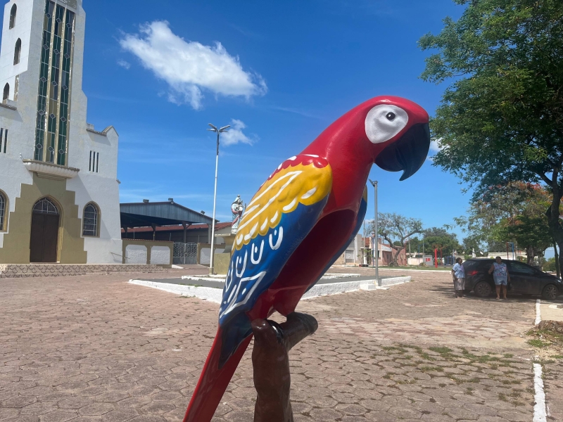A escultura revitalizada da arara agora embeleza novamente o entorno da Paróquia Nossa Senhora dos Remédios, simbolizando o cuidado da gestão com a cultura, o patrimônio e a identidade de Ladário.